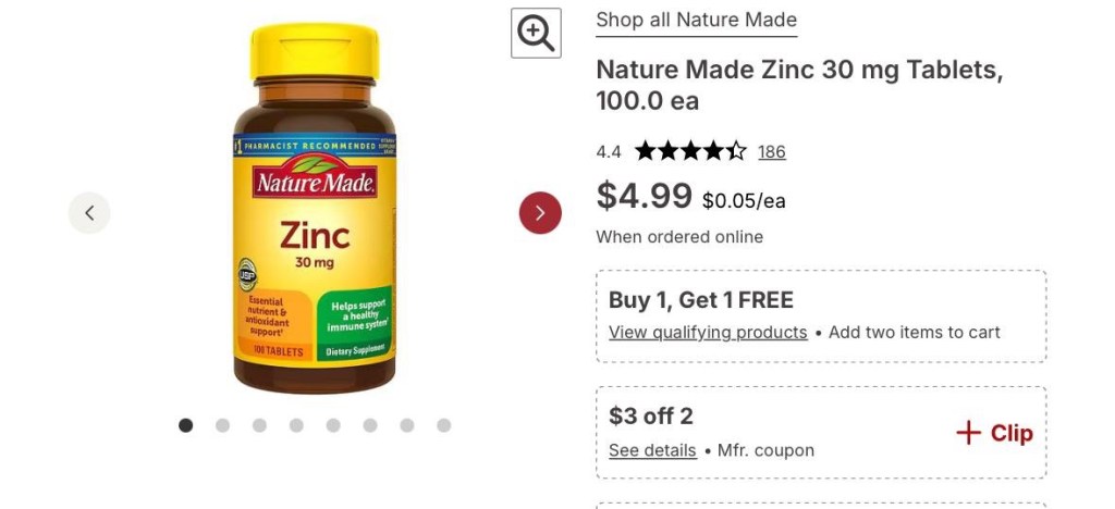 $1.99 for 2 Nature Made Zinc 30 mg Tablets, 100.0 ea