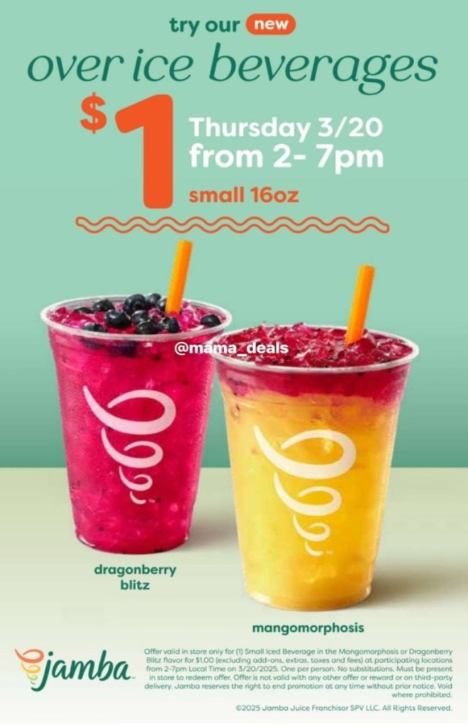 Jamba Juice $1 Small Iced Beverages on March 20th from 2pm-7pm local time at participating locations.