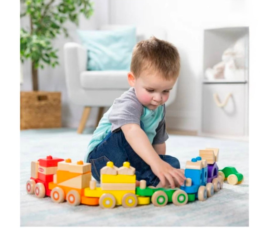 $15 Melissa & Doug Deluxe Wooden Stacking Train, 32 Inch Length, 6 Cars, 19 Blocks, 2 Vehicles, for Toddlers 2+