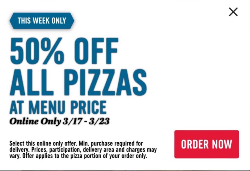 Dominos 50% all Pizza thru 3/23/25