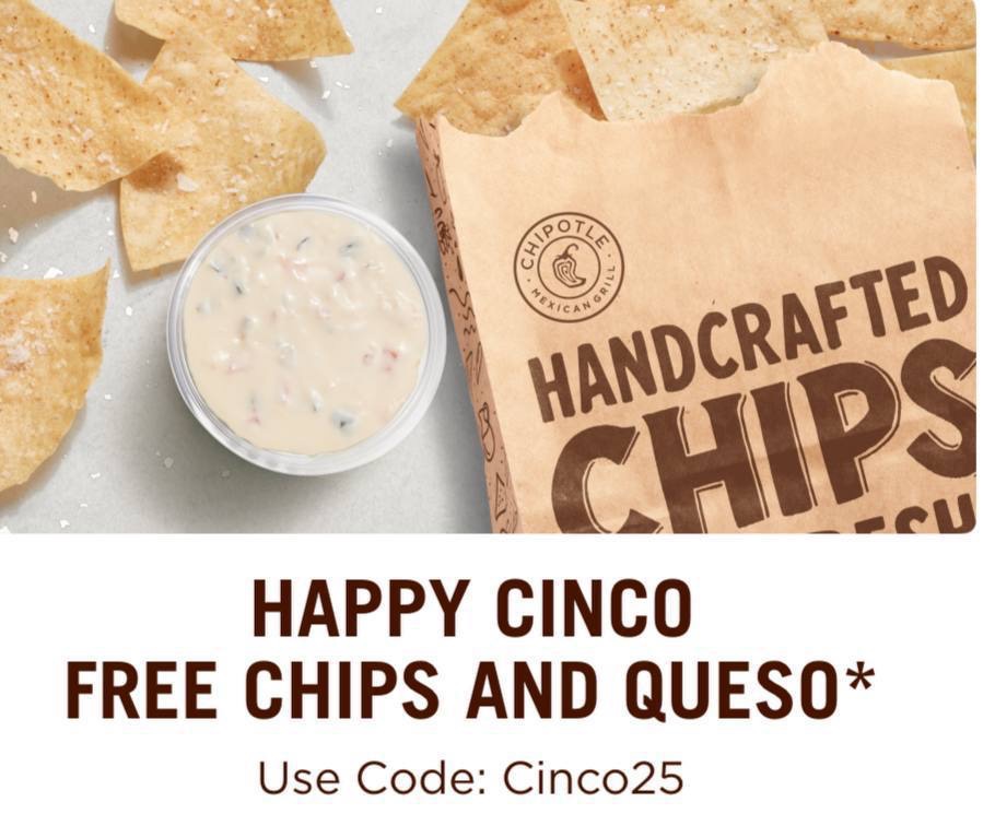 Chipotle Free Chips & Queso now through 5/5 w/Entree Purchase