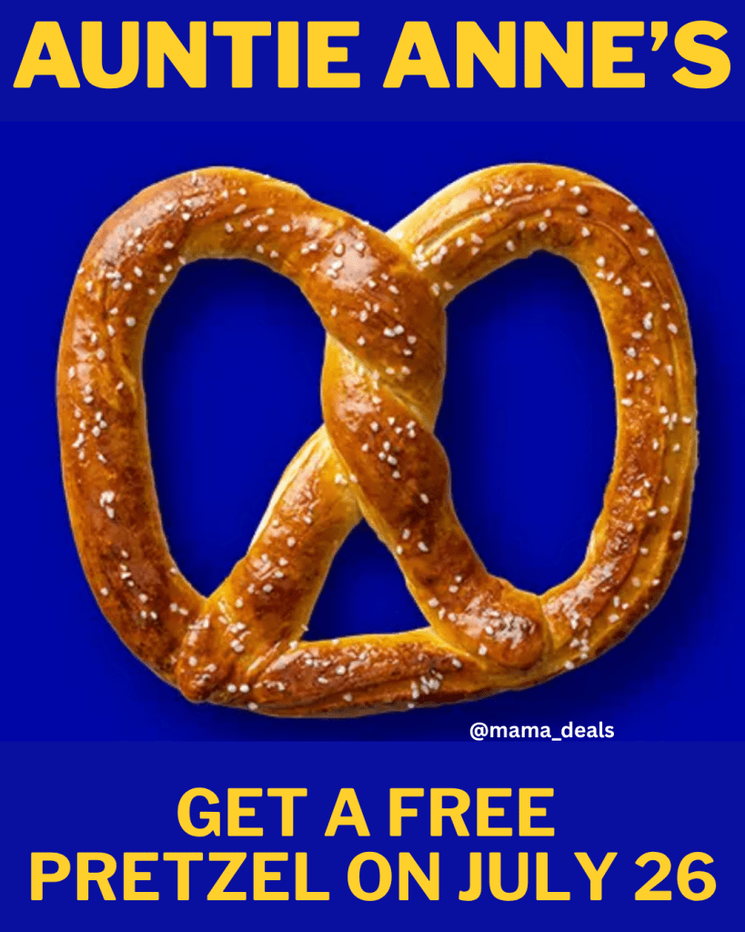 Today only, July 26, 2025, Auntie Anne’s is celebrating with a special in-app exclusive reward: Buy any pretzel item and get a free Original or Cinnamon Sugar Pretzel! This limited-time offer is available exclusively through the Auntie Anne’s mobile app, and you must be a Pretzel Perks Rewards Member to redeem it. Simply make a qualifying purchase and apply the reward in the app at checkout. This promotion expires at the end of the day, so don’t miss your chance to score a delicious free pretzel while enjoying your favorite Auntie Anne’s snacks.