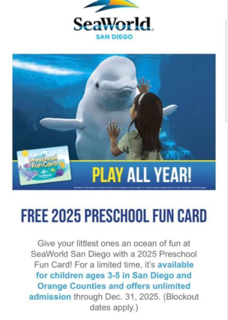 Only In SeaWorld San Diego & OC! Free 2025 PreSchool Fun Card! Ages 3-5 Unlimited Admission!