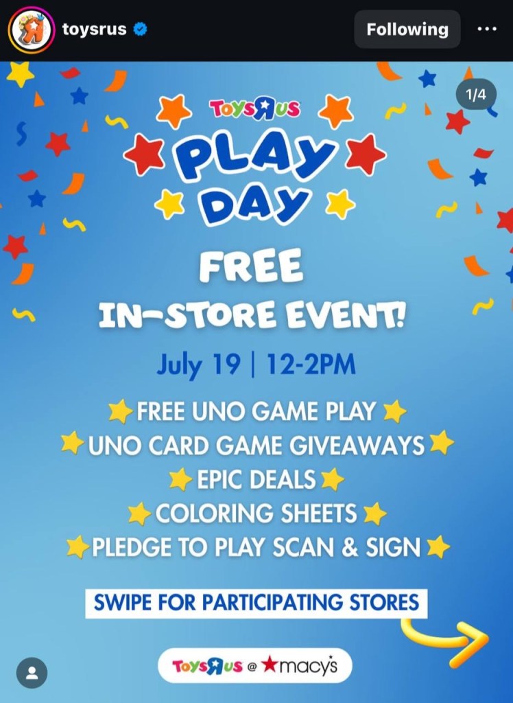Toys R Us Play Day will be on July 19th from 12-2pm in-store. Select locations only.